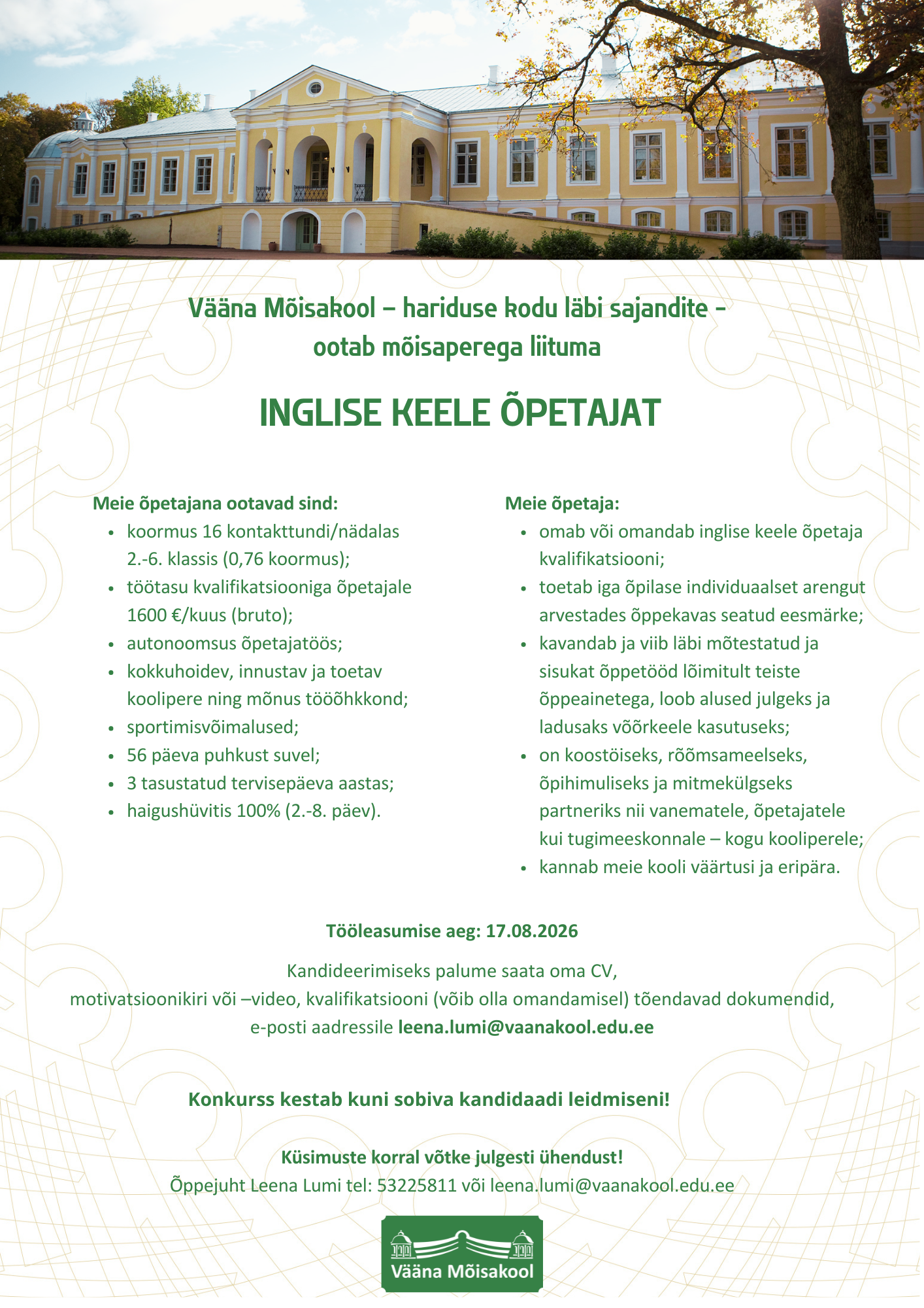 Vääna Mõisakool otsib oma meeskonda inglise keele õpetajat, kes soovib õpetada väikekoolis, kus väärtustatakse sisukat õpet, autonoomsust ja koostööd.