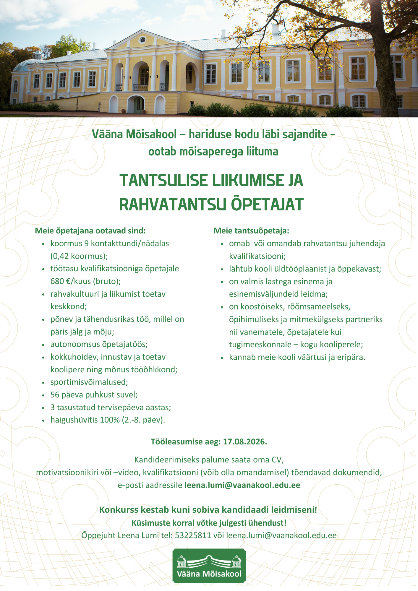 Vääna Mõisakool otsib oma mõisaperre tantsulise liikumise ja rahvatantsu õpetajat, kes väärtustab rahvakultuuri, liikumisrõõmu ja laste arengut toetavat õpet.